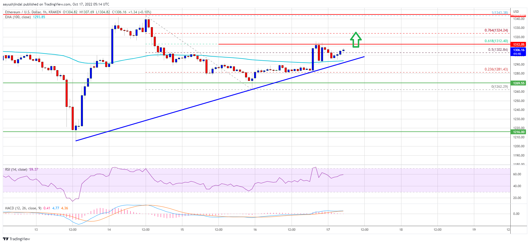 حرکتی به زیر سطوح 1320 و 1300 دلاری وجود داشت. قیمت اتر حتی به زیر 1280 دلار و میانگین متحرک ساده 100 ساعته رسید. با این حال، گاوها در نزدیکی منطقه حمایتی 1265 دلاری فعال بودند. پایین ترین قیمت در نزدیکی 1262 دلار تشکیل شد و قیمت اکنون در حال افزایش است.